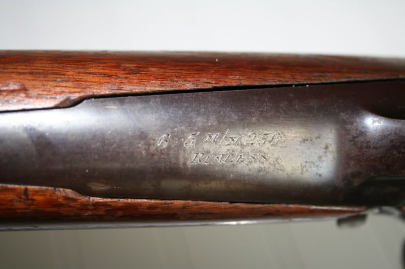 Mark, this rifle is marked, "6.5 M/M 256 RIMLESS" I see in the Ross Rifle Story, they list this model rifle as having been chambered in .256 Mannlicher. As it is a rimless case, I am sure is is chambered in the 6.5 x 54 Mannlicher-Schoenauer. That cartridge was designed in 1900. This rifle was made in 1902, I believe. As Sir Charles was very future-minded, it would make sense he would choose a new and recently developed cartridge.