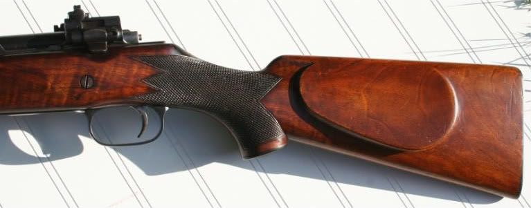 The first Ross had a grip too large for the average sportsman, a stock too long, and a grip shaped entirely inferior to that of the new Springfield sporter. In the second Ross the fault was not remedied but exaggerated. Of the scores of rifle cranks who have examined the sporting Springfield as made by Wundhammer, I have not heard one do anything but praise the grip and the stock shape in general. The grip is made 4 3/4 inches around, rather oval in shape and, last but not least, is made very close to the trigger - 4 inches or less from point of grip to trigger. The result is that the third, fourth and fifth fingers - or the second, third and fourth fingers, as you please - are supported by the grip and the trigger finger is left free to pull the trigger. Due to the grip being quite close to the guard, the stock is made shorter as the hand is carried further forward and the stock is apparently lengthened thereby. We have found that 13 1/2 inches is extreme - merely on account of this short grip.