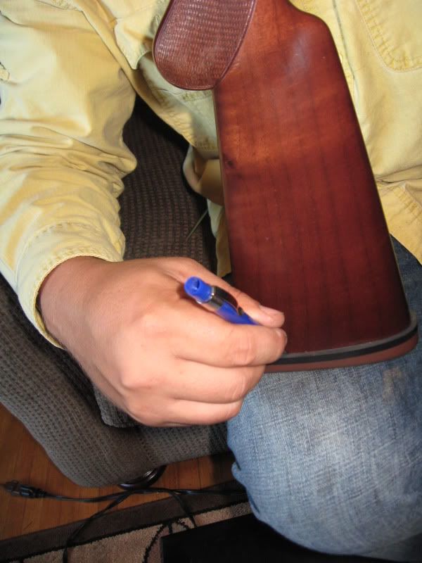 1. First I attach the pad to the base of the gun and trace the outline of the stock onto the pad