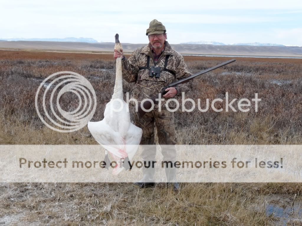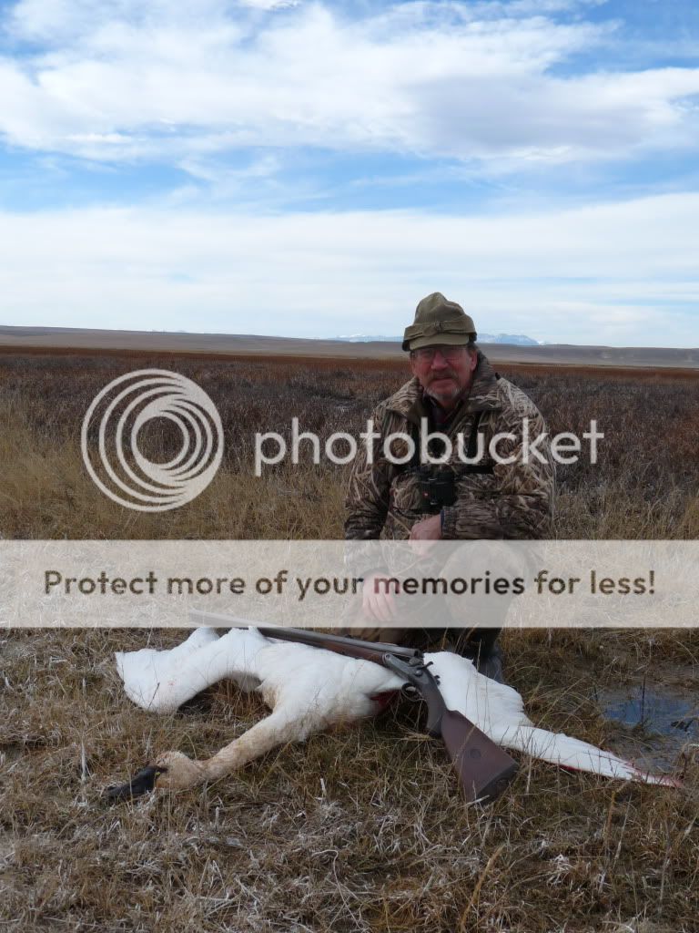 About a year ago, I started reading DGJ and got the itch for a blackpowder era shotgun. I have been shooting BPCR for years. I purchased a 12 gauge Parker Hammer gun made in 1883. I did this rather blindly, but the gun proved to be tight with clean chambers, even though it had a moderate amt. of pitting in the barrels. I wanted it for duck hunting. Then, I was lucky to draw a swan tag for Montana, and that began the quest to take a swan with a blackpowder load. So, the search began for suitable non-toxic shot, and with the help of this forum, I came up with a duck load using #5 bismuth and a Swan/goose load using #2 Nice shot. The load was 3.5 drams 3F black powder/1 1/4 ounces #2 Nice Shot. Enclosed are a couple of pictures of me, the Parker and the swan I took. Thanks to you all, and DGJ, for getting the interest started and for the ultimate journey with the gun. Now I am thinking about 10 gauge guns .........