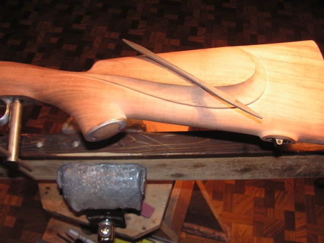 I can't imagine why anybody who expects to get er did wouldn't sink the outline of the quirk and the cheekpiece face with carving chisels and rough out that cove with several gouges of different sweep. I can understand why you'd fair and finish with files or floats.