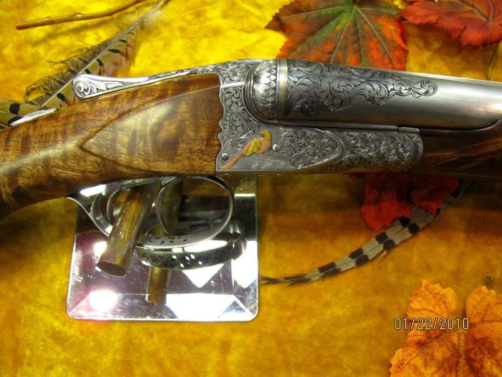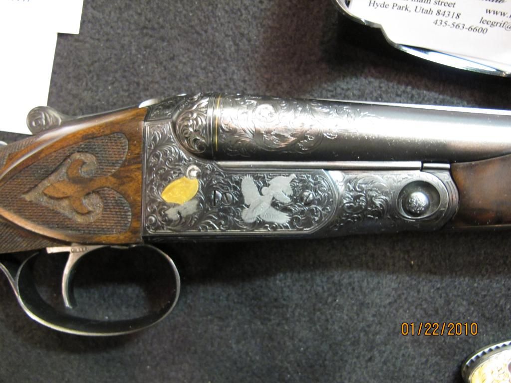 At first the size difference was discouraging; however, once I got my senses recalibrated and did some talking with the various engravers, stockmakers, metalsmith and gunmakers, I was in hog heaven. Each and everyone of these artisans and craftsman were willing to spend as much time as I wanted explaining their work. This was in stark constrast to most of what happens in the crowed and high-volume atmosphere at the SCI. I spent 20-minutes learning the finer points of crafting custom gun cases from Jim Wear. Robert Strosin spent considerable time with me reviewing the finer points of a custom A.H. Fox 16 project that is nearing completion (see photo below). I could go on and on; however, suffice it to say that you could easily spend as much time with the fine folks at the Guild Exhibition as I did at the SCI. A great opportunity to get ideas and connections for a custom project.