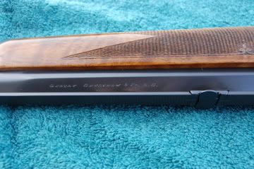 The gun weighs 9 lbs 12 oz. and has been nicely restocked in a fine piece of English walnut. If you look closely, you can see the small fleur de lis accent engraving in the wood checkering. The action has been nicely worked and except for a some nicks in the stock and a dirty bore (that quickly cleaned up) I am very pleased with the purchase.