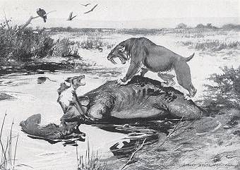 "Saber tooth tigers lived in Europe and North America. They were fast runners for short distances and probably ambushed their prey in packs. The Hoplophoneus species lived 20 million years ago. The Smilodon species lived during the Pleistocene from 1.6 million years ago to 10,000 years ago when it became extinct."