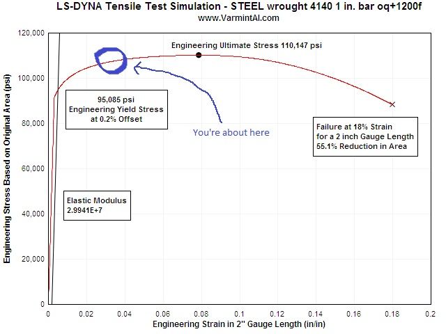 Just using 4140 normalized as a baseline here, it has around a 18% elongation at failure. Of course, as the elongation gets greater, the material thins, at these higher elongation numbers.
