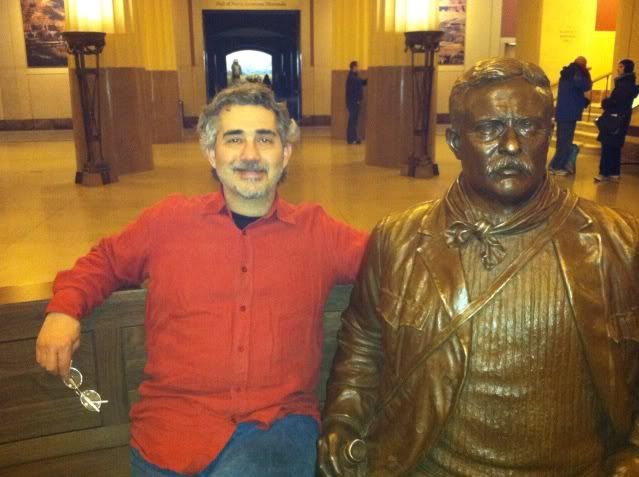 Yesterday I had the good fortune to spend the afternoon exploring parts of it again (it would take a couple of days to see it all)but especially the new Theodore Roosevelt Memorial. Along with many of the great man's artifacts there has been a major restoration of the North American Hall of Mammals diaoramas along with some from Teddy's Adirondack hunting area. The restorations are spectacular, especially two bull moose locking antlers and the Wapiti scene.