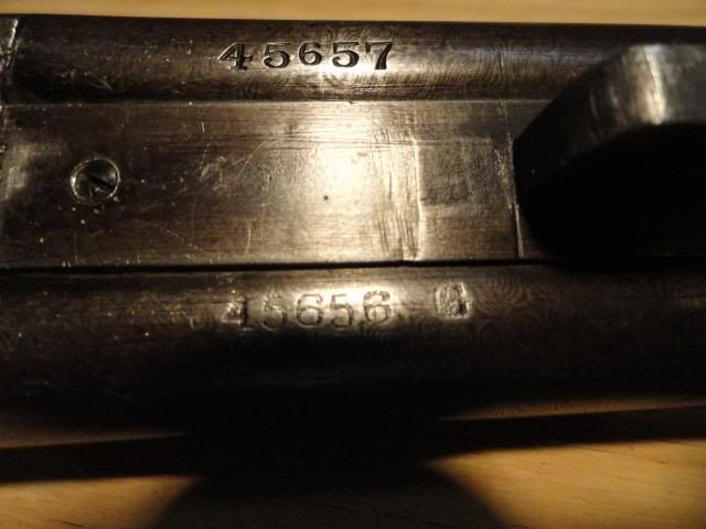 Kutter‘s theory would have barrel set, with extractors, stamped 45656 prior to assembly. A change in plans leads 45656 action being fitted with a different set of barrels and barrel set 45656 being set aside and fit to the next one down the line 45657. All other parts are stamped or engraved 45657.