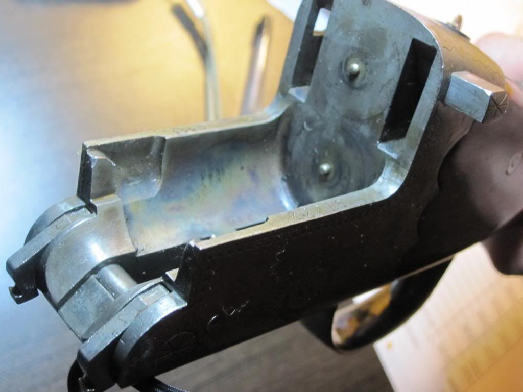Hahaha. Yes, Having the 2 factories side by side surely eased production deadlines. Apparently the Rempts also bought some property from Krieghoff to allow for their factory expansion. The 2 firms must have had a close relationship with one another. I would be curious though to find out who was suppling the other. Seems like the Rempt brothers had a very good post war business going if they where buying land from thier neighbors. Phots below.. Top of barell with steel makers and "NITRO"  UNDER BARREL>> not much there!   INSIDE RECIEVER
