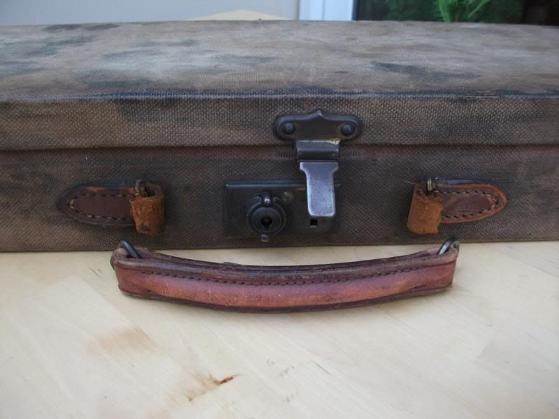 From the photographs you can see that there is none of the usual leather edge protection strip fitted in fact there are marks from corner protectors made from compressed paper that had been fitted with glue though now long gone. The covering is Cotton Calico a very light weight canvas. The external lock is made from plated steel rather than the traditional Brass, also the leather fittings are made from low quality leather so possibly the handle did not stay attached to the case for long before the case and it parted company.