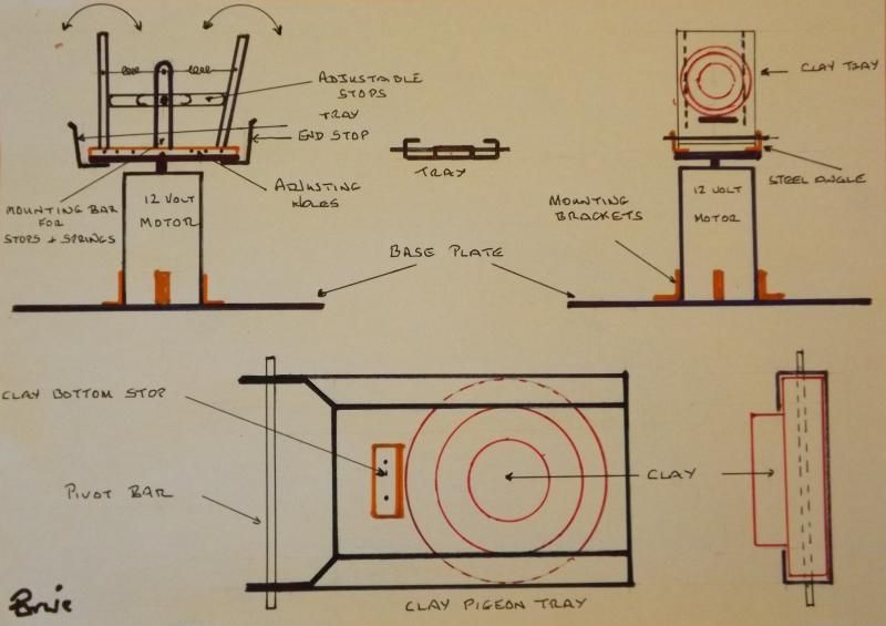 I would firstly like to say I personally have never built one of these launchers but with the help of friend’s memories I am sure we have managed to put together how they were constructed but I am sure there will have to be some trial and error effort invested to get the launcher to function correctly. Now after talking to friends about these launchers I have come to the conclusion they were put together without any thoughts as to safety in operation so the design I have come up with is as safe as I can make it. There are two nuts and bolts in the construction of the spinning plate (for stop adjustment) all the other assembly pieces on the spinner plate must be welded as must the motor shaft to the plate also the tray pivot bar ends should be drilled through and fitted with two split pins at each end about a quarter of an inch apart one as failure backup. These whirly bird launches where always surrounded on all sides by hay bales to stop any chance of a person being injured by a broken clay or a part of the thrower that may come adrift, so it should go without saying no person should be in the hay bale protection area when the launcher is in use. I cannot stress the importance of safety with regard to building or using a launcher of this design if a tray or the top plate or any large part come off when running at full speed it will have the potential to decapitate you at worst and at the very best put you in hospital for some considerable time. From the drawing you will see that the heart of the Whirly Bird is an automobile starter motor (now builder described the old type Brit motor with a Bendix gear on the shaft which engaged though I should say chewed the teeth on the fly wheel periphery) but like your good selves all the automobiles here now use the pre-engage type motors using a solenoid. So firstly you need to remove the pre-engage solenoid and put it to one side because it can used on a more devilish variant also you need to disable the motor switch that the solenoid acts upon to switch the battery power to the motor, you need to do this so the motor will spin as soon as voltage is applied. Now one thing about starter motors other than they have massive amount of torque but without the load of the engine the terminal no load speed that they can reach is awesome so find yourself a well made heavy duty type with lots of torque. Next the motor is mounted with the motor shaft pointing vertically upwards, I will just say the older motors had a steel casing that enabled four ‘L’ shaped brackets to be welded to the side of the motor for mounting onto a base plate. The construction of modern motors are many and varied so some amount of ingenuity will be required to enable a strong firm motor mounting. Next a steel plate (the spinner plate), now we think it was approximately 8 inches long by 5 or 6inches wide with a hole at the centre allowing the motor shaft to pass through so it can be welded to the plate for safety reasons it is imperative this union is welded also welded along each of the long sides is a suitable length of steel angle to mount the clay trays and mounting bar for mounting the stop’s and springs etc. which also must be welded. You must make efforts to mount the plate at right angles the shaft to keep vibration to a minimum, and with every subsequent piece you apply to this plate you must do your best to keep it in balanced so it spins as true as possible this is extremely important and cannot be emphasised enough. The way it works is extremely simple at each end of the spinner plate are the clay launcher trays and a tray stop bar to limit the trays travel to the horizontal this is a safety precaution in the unlikely event that the clay has not left the tray before it reached the true horizontal position, at each side of the spinner plates centre line are the two vertical anchor bars for the adjustable stops and the four tray springs. The inner stop bars are the trays vertical limit stops and you will see that one tray is positioned off centre this off centre position will mean that the clay in that tray will leave the thrower first creating a delay for the second clay. Also on the spinner plate you can see a series of holes so you can move the trays closer to the centre which will also adjust the timing clays leave the trap. One last thing it is the strength of the tray springs that determine how fast the spinner plate has to be traveling before the centrifugal force is enough for the clay to exit the tray and travel through the air. The more sophisticated versions uses the motors redundant pre-engage solenoid to make a target release on command unit but still utilising adjustable tray angles though they are permanently fixed in use. The electrical release versions let the motor reach terminal speed before the target is released increasing its flight speed, also the electrical control circuitry is arranged to disconnect the voltage supplied to the motor as soon as the target release button is pressed. And finally as you will see I am not the world’s finest technical drawing exponent also I must admit I started to lose the will to live when switching on my scanner it immediately decided to take up smoking. So I photographed the drawings, also they are not working drawings just overview drawings though I am sure if you really want to construct one of these devilish things there is sufficient information for you to do so.