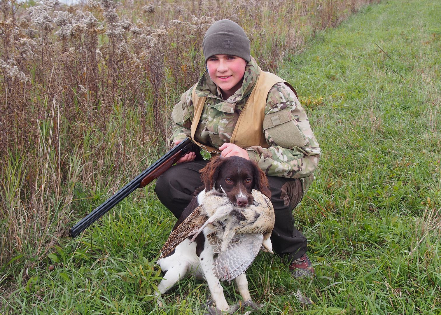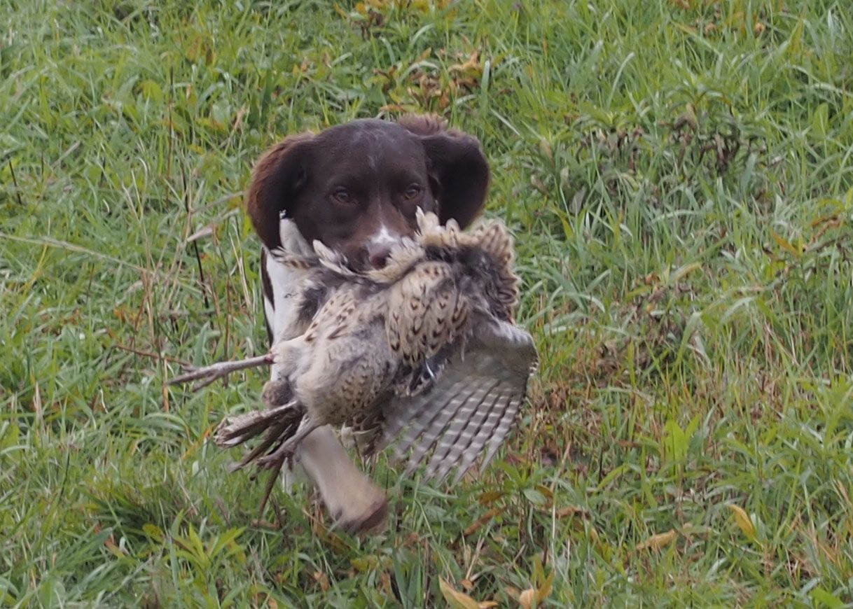 Update on new pup originally posted July 22, 2015: I took my youngest son (14) and Mollie (5 months on the nose) to get a taste of some real birds. I worked the dog and my son gunned. It was his first time bird hunting and Mollies first time as well. My son shot his first bird ever and it was also Mollies first kill that she retrieved. Both performed flawlessly. He used a Ruger red Label 20 Ga. and missed with the first barrel at about 25 yards and I told him to shoot again (he was a little surprised by the whole thing since it was his first flush) and he nailed the pheasant clean at 40 yards or so. Dead in the air. Mollie was on the bird in no time and she did a beautiful retrieve, no fumbling, no half the bird out of her mouth. He also got one Chukar which she also did a great job on. The days we live for!!