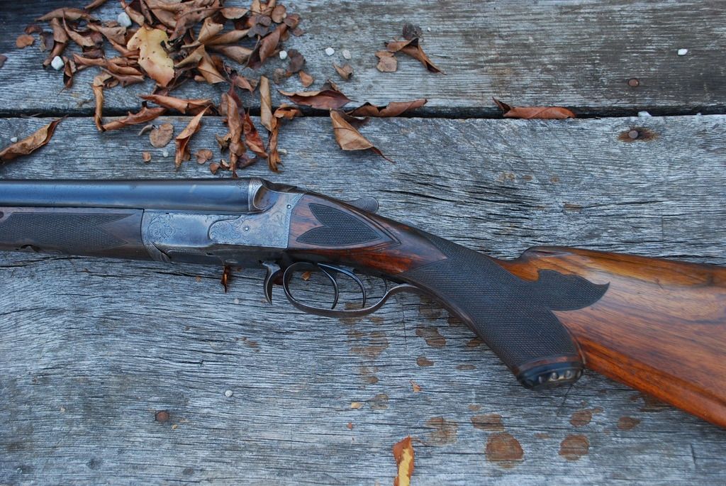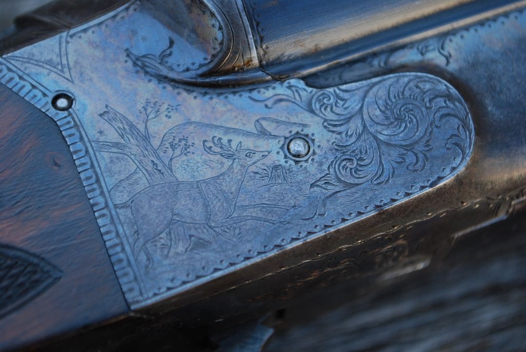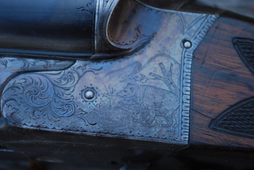 A very nice old TBG Co gun there Friend, and what a thrill it would be to take a whitetail using that piece. These guys are correct, your best alternative is to raise the height of the front sight; and as all the examples I've seen are dovetailed into the top rib, finding a replacement to work shouldn't be too difficult a challenge. I would strongly encourage not using a tang sight, as doing so would require drilling after-market holes into the top tang; and if you retain the sliding shotgun safety along with the new sight, you'd be forced to notch the comb of the stock to get enough set-back for the sight base. I know of one very nice and rare little 20-bore Hollenbeck to which such a tang sight was added; and not only did the installer screw-up the top tang and stock, it looks completely out of place on the gun. On the other hand, I've seen one example of a Hollenbeck drilling that featured a factory tang sight. That sight was inserted into a very neatly formed/sculpted hole in the stock just ahead of the comb. It was not attached to the gun, but was a separate piece designed to inserted for use when needed; with the result that it did not conflict with the flowing lines of the gun when not in place. I don't own a Hollenbeck drilling (yet), but find these guns most intriguing. One of our members owns drilling number 7; and some of its features are a skeleton butt, tubular cartridge trap located in the checkered butt end of its stack, sculpted barrel lumps very similar to those found on highest grade Lefever guns, and a very long trigger guard bow that also covers the rifle barrel cocking lever. I do however own a rare Hollenbeck Gun Company double gun; and although this old gal saw lots of use and needs TLC, she's all there, has excellent 30" bores, no after-market alterations, and remains in good shooting condition. This gun is #28, is a 12-gauge, is not grade marked, is English stocked, features almost 100% engraving coverage with game scenes (pointing dogs or either side, and covey scene on trigger guard bow); and weighs in a 7 lbs./6 oz. It also has a few other neat features such as finely checkered triggers, "dimples" at end the muzzle ends of its barrel ribs very similar to higher grade LC's, and highly polished (plated?) lock work.