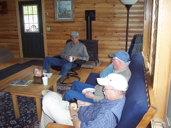 Author Ted Lundrigan, Norm Moody and Vic Ricci relax in the clubhouse before shooting