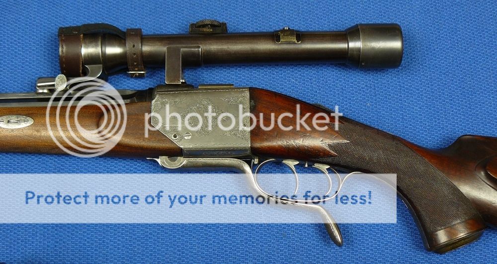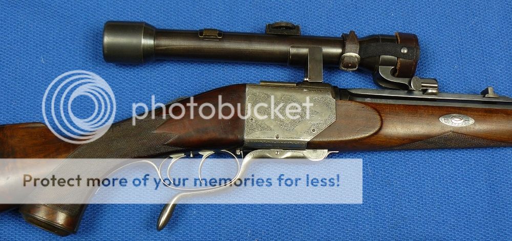 This 9.3x74R has been my hunting rifle for many years. It was marketed by H. Scherping in Hannover whom I believe was usually known for upmarket goods. The proofs are the standard B, U, G, and crown over N. The Krupp Stahl barrel carries the 108/49 bore gauge mark and the 3.5g GBP over St.m.G standard proof load for the 9.3x74R. The combination of these marks I believe points to a fairly early date in the 20th century. It has some features which strike me as a little unusual such as the half round barrel with a full length swamped rib with a flip up moon sight; the tang safety; the stock butt finished in the round without a buttplate; the horn part of the pistol grip which is inletted into the stock; the nontypical engraving (at least as I see it); and well, the action itself. The action is basically a Germanized Fraser. Take a Fraser with the side lever off and add an attachment point for an underlever to the trigger plate with a simple link to the breech block, replace the stock through bolt with normal screws in tangs, and, of course, add double set triggers and voila! Does anyone have any information to add on this action?