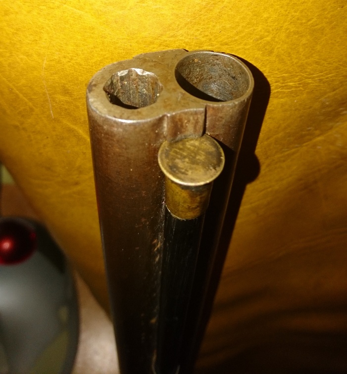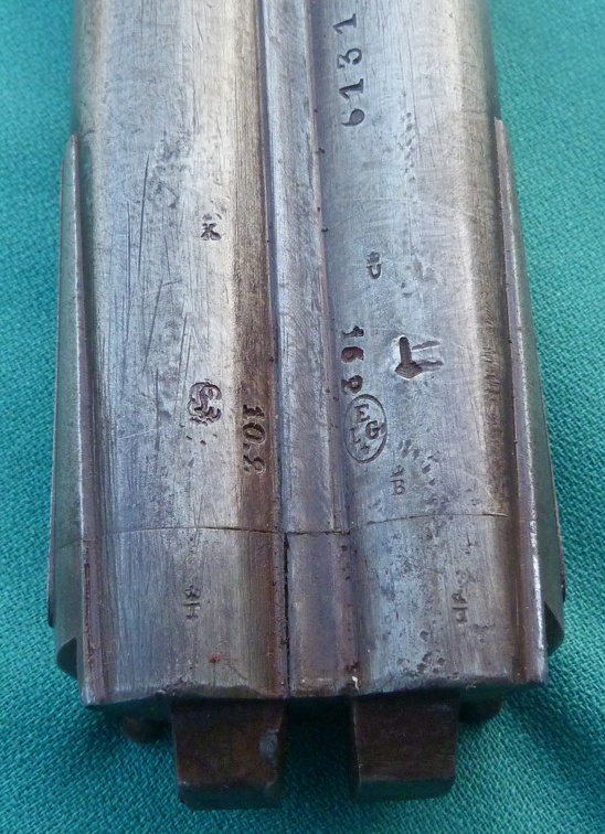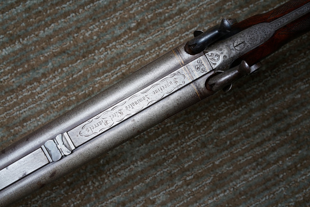 Cape gun. The seller thought this was German. The rib text suggests, and proof marks verify, it's Belgian. But it's a very good quality gun. Near as I can tell from proofs, it was made between 1853 and 1870. It was barely shot and the bores are still quite bright once I removed some grime at the muzzles. So I'm deducing either it was pricey enough to be a collectible, or made right at the end of the era as cartridge firearms came along and sat on a shelf or a wall and never saw much action.