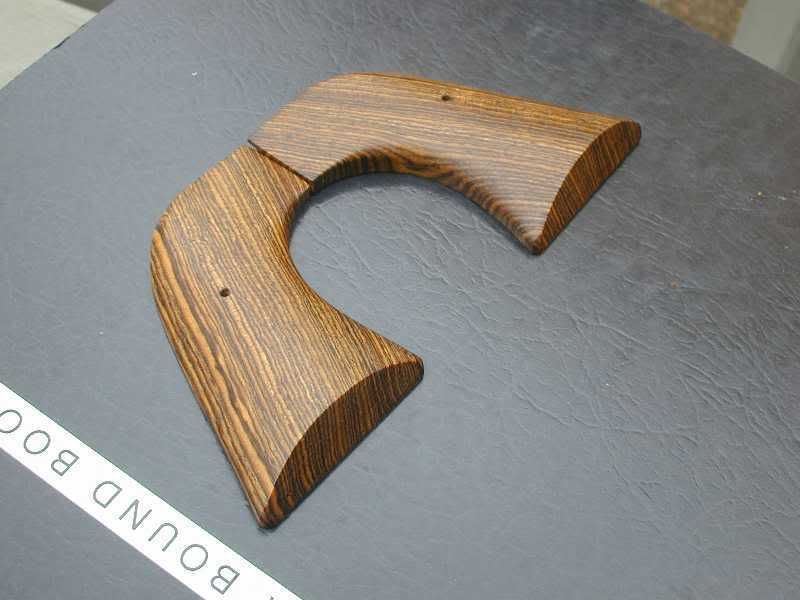 My amazement and admiration for the members with good gunstocking skills (particularly shotgun stocks and forends) is occasionally tinged with excruciating envy. Afraid I don't have that tune in my head as my one attempt at finishing a pre-inlet forend for a Fox BE did not produce an enviable let alone a utilitarian result. I did manage to make a set of grips for my Ruger Old Army yesterday at work. [img]  [/img] I think the wood is Cocobolo; came from Atlantic Aviation when I worked there in the late seventies. Did final fit to the grip frame and finishing (yes, it's slackum oil) last nite and finished at 2:30 AM. This is obviously a show-n-tell but also need advice on a tie-rod. I don't want to rip the bolt and threaded bush out the original grips although they're nothing special. I stopped at the Tru-Value yesterday evening to see what they had in "sawbolts;" nothing but #10X24 in alumimum and the heads are gigantic. I can't find a source for grip hdware; thinking of steel or brass hexnut or knurled round nut and a roundhead bolt maybe 6 or 8X32. Also thought about buying a set of Ruger grips internet auction and stripping out the fasteners and the medallions. Advice appreciated. jack