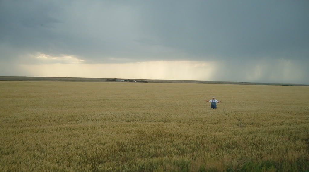 Diane took this today as I was checking the wheat right next to the house. This may be "The middle of nowhere" But we love it! Just as I was leaving the field, a flock of Prairie Chickens lifted out of the oats across the road to the south, and argued their way overhead...