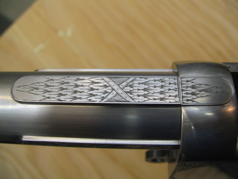 I have temporary custody of the Wesson rifle that has appeared here in the past, part way through its engraving. I guess Mr. Hurst did not consider me stable enough to see it all at once and had decided to break it to me in stages. In any event, I took a few quick pictures before doing a bit of work on it and sending it on back to NC.