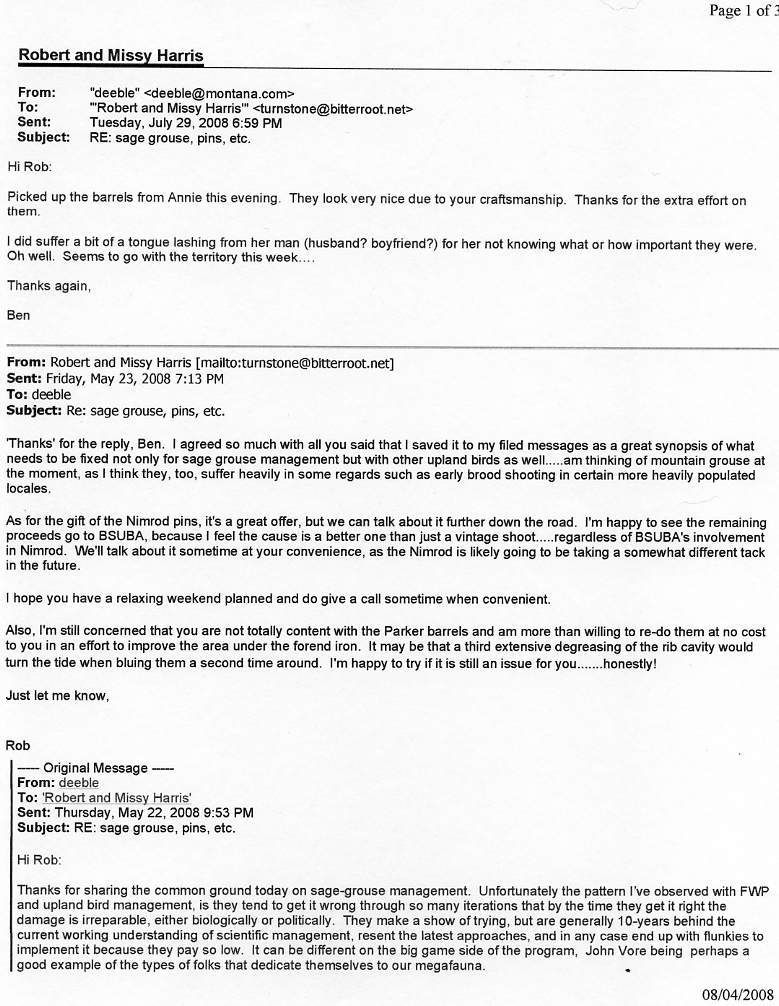 Actually, this was the second time that I re-blued this particular set of barrels, as I wasn’t totally content with how they came out the first go-round, and it was I who pointed this out to Ben. (See remainder of attached e-mail). The first time resulted in some slight staining around the weep-hole, because I had a most difficult time purging out the rusty contaminants between the rib(s) compartments. The resulting stain was small, just several inches along the bottom rib, yet was totally covered by the forearm. I charged him $275.00 for the job with this ‘caveat’ that if he, too, was displeased with the slight staining, I’d be happy to re-do them at ‘no-charge’. Contrary to what Ben Deeble says (and those of you here with any rust-bluing knowledge can concur) the stain was not “pink”, but a dull plum brown. Two weeks or so later, Ben said he wouldn’t mind if I tried to correct the problem. I gladly agreed, even picking up the barrels at his Missoula residence, and solved the problem by first injecting trichloroethane into the rib compartment and letting it stand this time for 24 hrs, followed by the same injection and 24 hr. soak with alcohol for two more cycles. That apparently did the trick as my subsequent degreasing and rust-bluing resulted in a very pleasing job both to me and apparently Ben Deeble, as his attached e-mail here confirms. At no time did Ben Deeble pay another ‘sou’, and you’ll have to trust me that I wasn’t looking for any, as I guarantee my work.