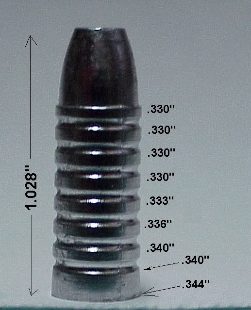 The Pope .32 caliber moulds are typically made with seven bands (.33 are eight) the first three or four are bore diameter .314" the next bands are .3225" and the bottom large band is a tapered band starting at .3225" with the bottom at .327".