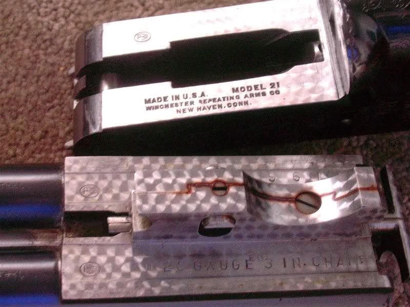 To complete the information about Model 21 20 gauge 3" chamber markings, this picture shows the barrel flats and water table of a 'Custom Grade' Model 21 20 gauge 3" Magnum built in the Custom Shop in 1968. The barrels have no markings other than "Custom Built by Winchester' on the Rib.
