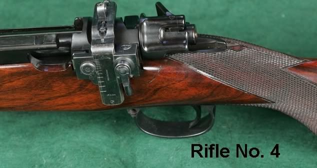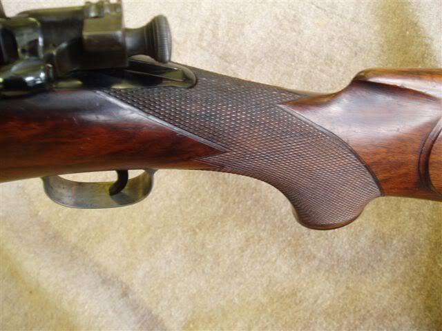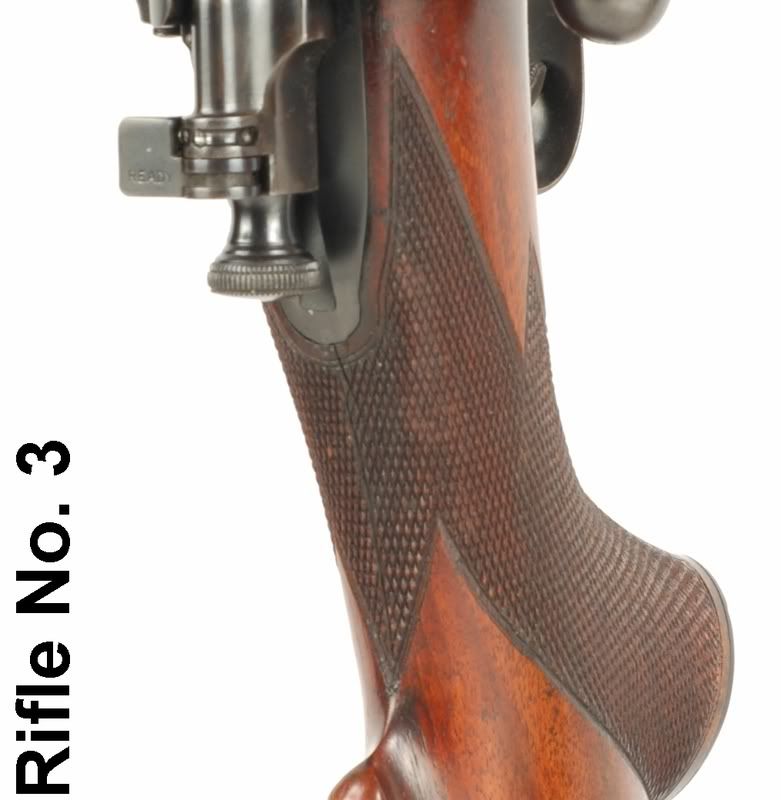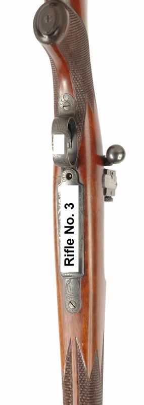 # 3 looks like it has a Wundhammer grip swell, perhaps the others also which would explain the apparent thickness of the grip. It makes the grip cap look smaller in daimeter than the grip. The inletting looks very tight on all three and the way the checkering joins at the top of the grip looks similar but not identical to the way Rodgers (I think, I'll have to check your book) joined checkering at the front of the pistol grip. I don't know how he managed to cut right into the inletting on the Mauser tang without knocking out even a small chip.