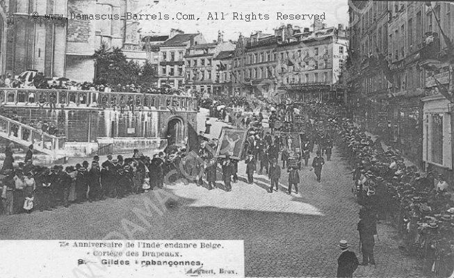 The early Belgian guild system is harder to "pin down". Often this was father son relationship. Journeyman were often hired based on the number of sons they had. It was assumed you would go to work with your father and run errands for the shop.  If not run errands, then most certainly do much the same work.  There was also in Belgium the practice of doing piece work from your home. This is a staged image for a postcard, but it does represent a certain truth about the industry.  In some ways, things have not changed. This is an image of engravers working out of a kitchen.  The Belgian Guild marching in a celebration.  While the guilds were strong in Belgium, there does not appear to be anything as organized as the German system. Pete