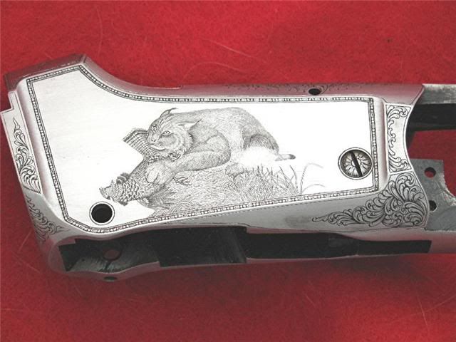 Here's a picture of my low wall that Ken is doing for me as time permits. I didn't plan on such elaborate engraving but Ken being Ken it took a life of its own. Ken says that he has since changed the rear of the Lynx and there is a lot of background detail still to be done but spectatular none the less. If the lazy-butt stockmaker comes up with a checkering pattern, the plans are to take it to the ACGG exhibition next January.