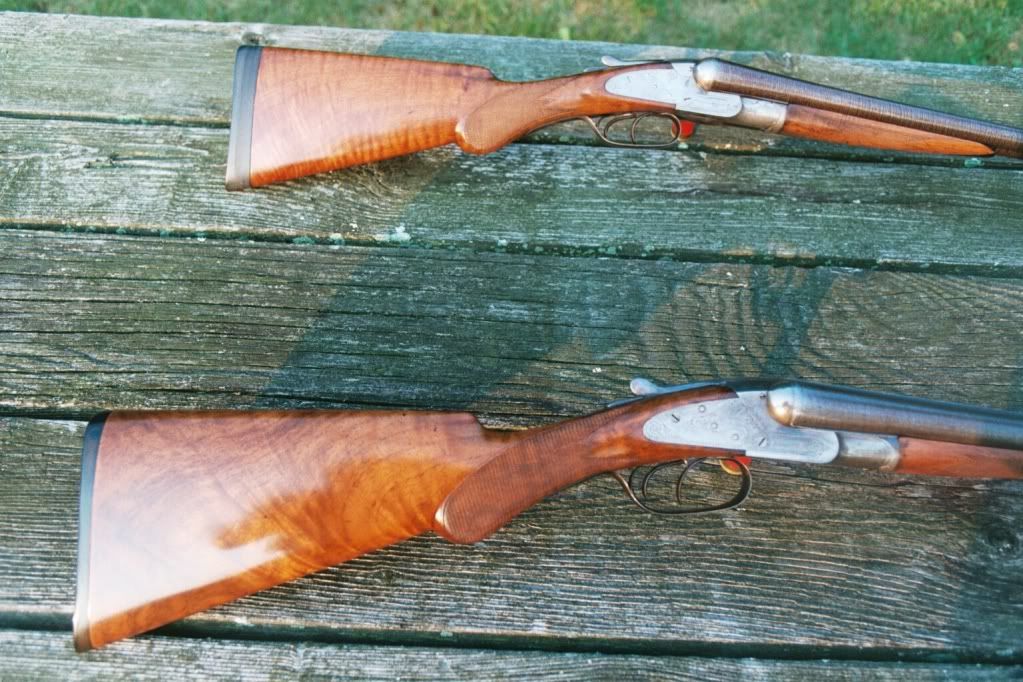 Thanks for the photo. Are there any forend tips in ebony or horn or some type of escutchion? You have 2 very nice looking guns. The butt stock wood needs to be cleaned and the recoil pad replaced.