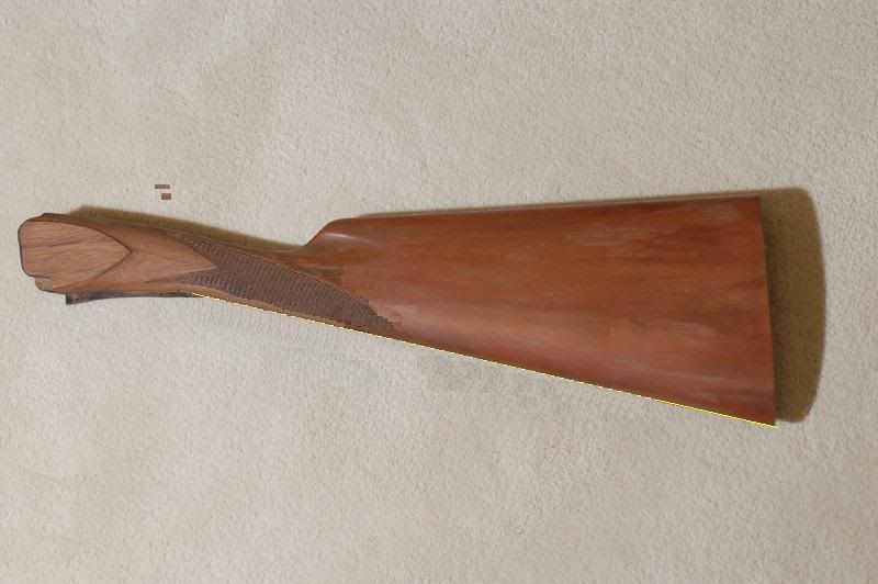 I think all checkering is removed and redone. If you take a straight edge and place one edge at the toe of the stock and the other at the point near the end of the lower tang, where the pistol grip turns down, you can see a line that would be the finished straight stock conversion. I believe the whole lower line of the stock is raised to make this line work.