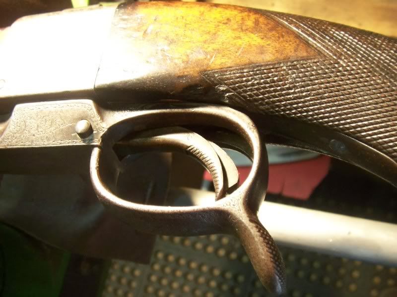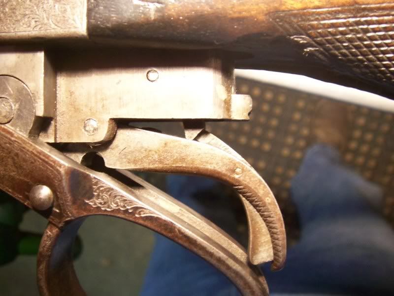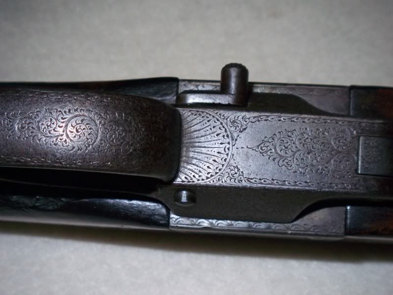 I'd love to see the shape of the barrel at the muzzle, is it round? What Does the trigger flag do? I think I wrote that the sidelever I photographed had the set-trigger patent, and the lever, but no set-trigger. I love that clam-shell engraving in front of the lever/guard!