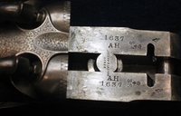 LD1, Thanks for the reply. This is not a rifle,but a shotgun. Made in 1877,according to the Henry book at Dickson's. Nothing unusual about the gun other than these #'s. Hammers,damascus barrels,bar action. The gun was originally non-rebounding, converted by an agent of Stantons,and bears the use stamp on the inside of the lockplate. The description in the receipt book states a "patent 146".I beleive this to be a use,not a patent number,and may refer to a Hodges patent concerning the extractor. That's about all I have so far. So what could these #'s mean?