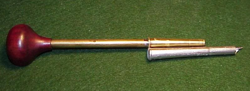 The breech-seater is one I made back when I was a kid and first started playing with schuetzen rifles. I took a 32-40 case and drilled a 5/16" hole through the back and adjust the seater then solder it in place. I could not tell you how many times this has been soldered. When I find a good length I make a new one for that rifle.