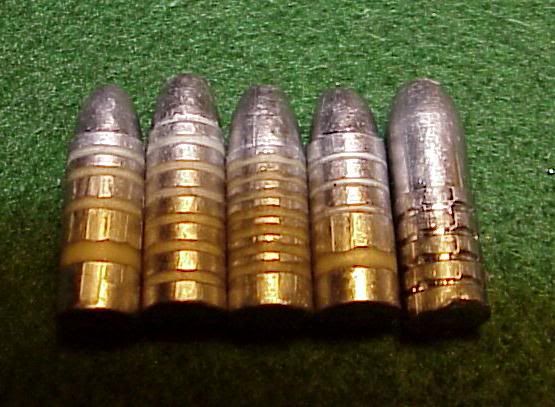 I have a pile of .32 caliber bullet moulds so I can try many and see what if anything will shoot in this rifle. Can you see where the rifling marks stop just short of the base on the bullet on the far left? This is about where I like to start bullets and I have adjusted the seater for this.