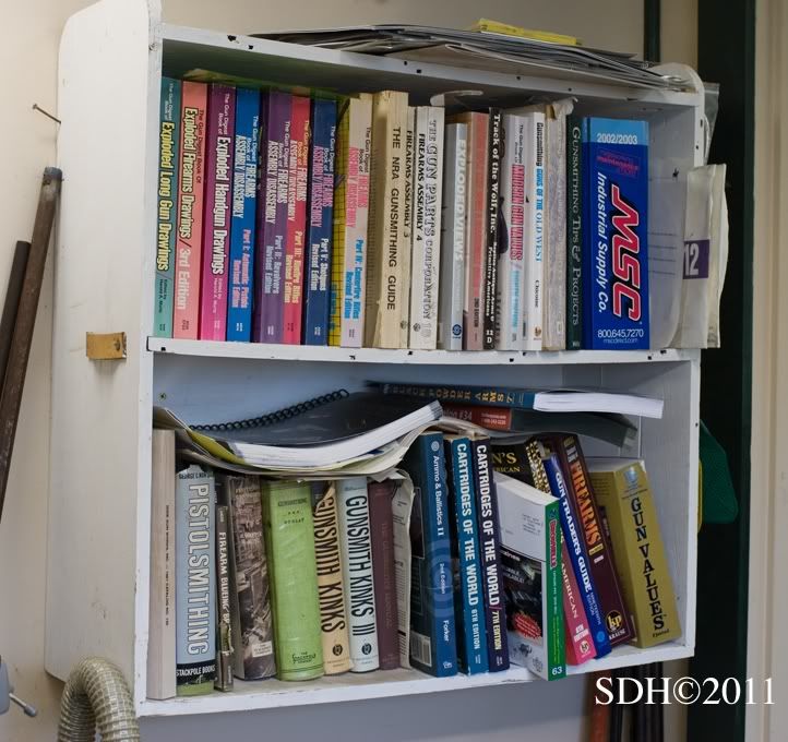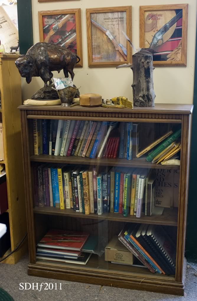 My books are all in boxes right now as we work on a family room/man cave remodel. Here are a couple of pictures of the library to be. Both are built by me from Alaskan birch I harvested and had sawed into rough cut lumber. I milled the lumber after a little over a year of drying. I have a moisture meter to assure the moisture content is around 6-8%. There is one more, a reloading hutch with doors and drawers and one book shelf for reloading manuals. It is still in the shop in a state of near completion. A desk will round out the furnishings but I haven't started on that yet.