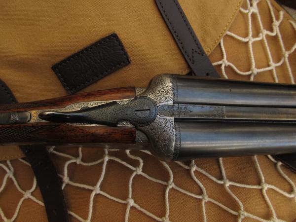 The view shows a fairly common quirk of the Blanch back actions from around this time. Both Perkes and Deeley's patents for ejectors are shown on the action flats which may reflect the fact that they were locked in a legal duel over the ejector patent used in this gun at the time of its manufacture!