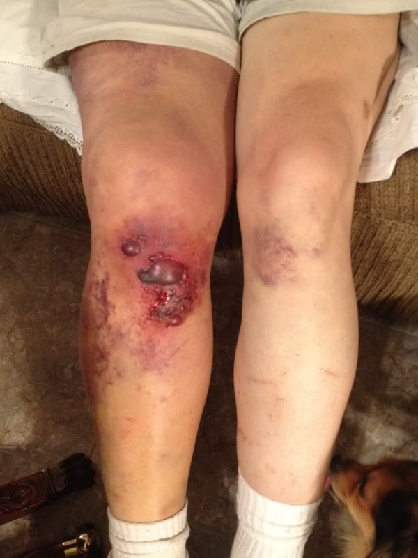 You know, it COULDA been a lot worse! I mean, after all, just think about how bad that knee woulda looked if some of the 325-lb impact hadn't been absorbed by my ribs breaking against the Krag stock breaking against the floor!