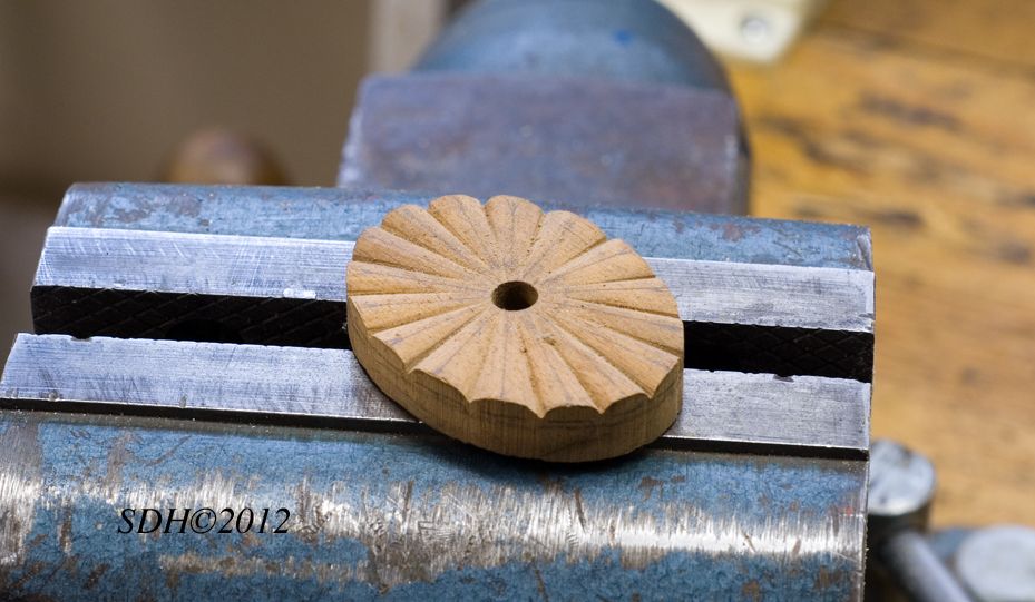 I hand-filed this one in fruitwood years ago, just to see if I could do it. As I remember it took several hours of careful work. It still has layout lines and is in need of refinement. Brownells sold a pressed horn sunburst grip cap eons ago. I put one on a small ring sporter 7x57 I built in gunsmithing school.