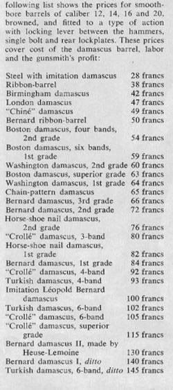 Please note that Pete's Ferdinand Drissen 1897-1898 price list is for finished barrels, but certainly reflects the price differential for the various patterns. The conversion of Belgian francs to U.S. dollars in 1900 was about 5 francs to 1 dollar. The complete charge for the barrels and gunsmithing for '3 band Crolle' was 80 francs or about $16. In 1900, Jean Lejeune of Nessonvaux listed the following prices for damascus barrels alone: 'Oxford'-16f 50 'Boston'-10f (about $2) 'Birmingham'- 8f In 1914, Arthur Delvaux-Heuve of Nessonvaux offered both '3 Band Boston' and 'Starred' for 12 francs 50 and Birmingham (Twist) for 7f 65. The 1902 Sears, Roebuck & Co. catalog lists the Remington 1894 A grade with “two stripe Damascus” for $35. It would would have been much more economical at that time for Remington to source their tubes from Belgium. Steel barrels were introduced on the 1894 Remington Hammerless in the Remington Arms Co. April 1897 catalogue. "Remington Steel" sold for the same price as the ordinary Damascus barrels on A-grade guns. "Ordnance Steel" barrels were offered at the same price as the fancier Damascus barrels on grades C and above, but cost a $10 premium on A- and B-Grades when introduced in 1897, and climbed to $15 by the 1899 catalogue and remained so through the 1909 catalogue. From http://www.la84foundation.org/SportsLibrary/SportingLife/1895/VOL_26_NO_10/SL2610011.pdf we know that the rough forged tubes were paired, wired together, and 40-50 shipped together, but I've never seen what U.S. makers were paying. Most were matching nicer (more attractive or complex patterns, not necessarily stronger) damascus barrels with higher grade guns. The A.J. Aubrey price lists are here http://www.picturetrail.com/sfx/album/view/17474742 and the cheapest had Twist or "Armory Steel". Certainly after WWI the price of damascus tubes increased but I suspect most U.S. makers were using up stock on hand ie. purchased at the c. early 1900s price.