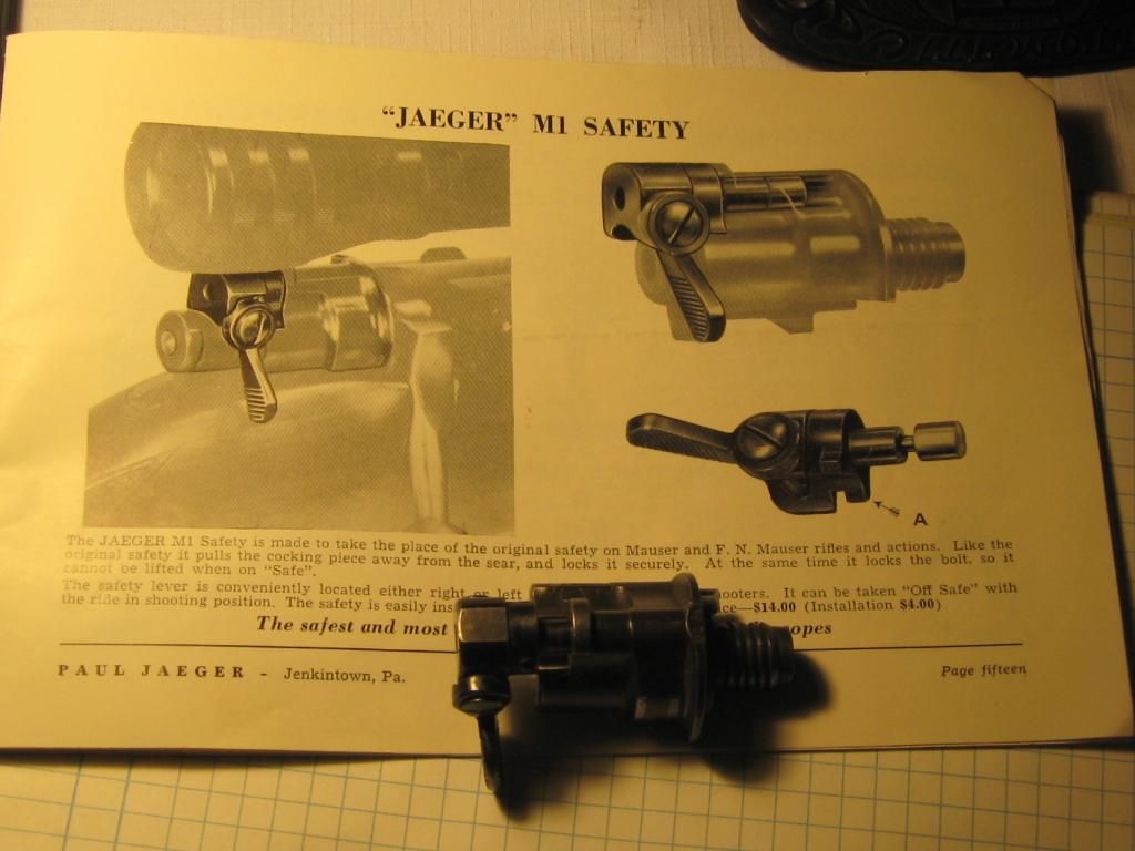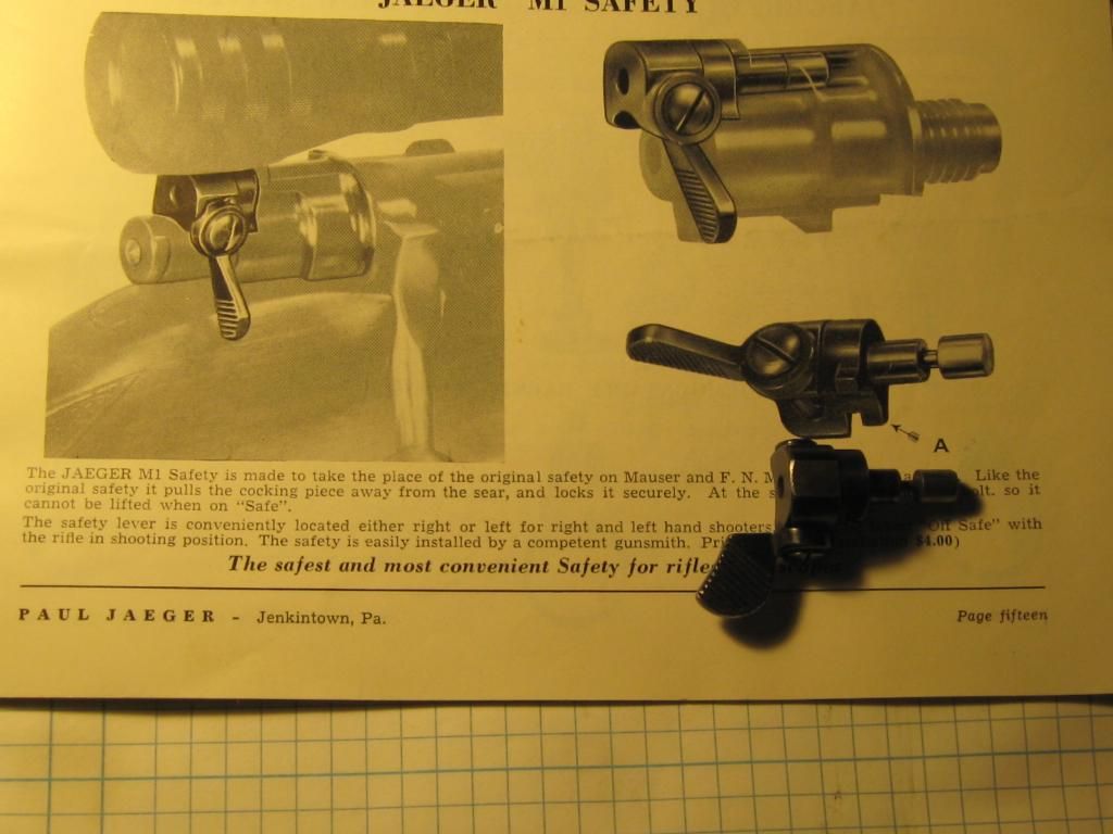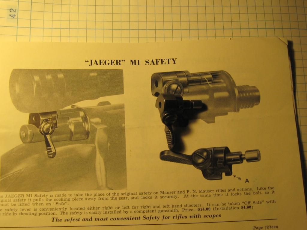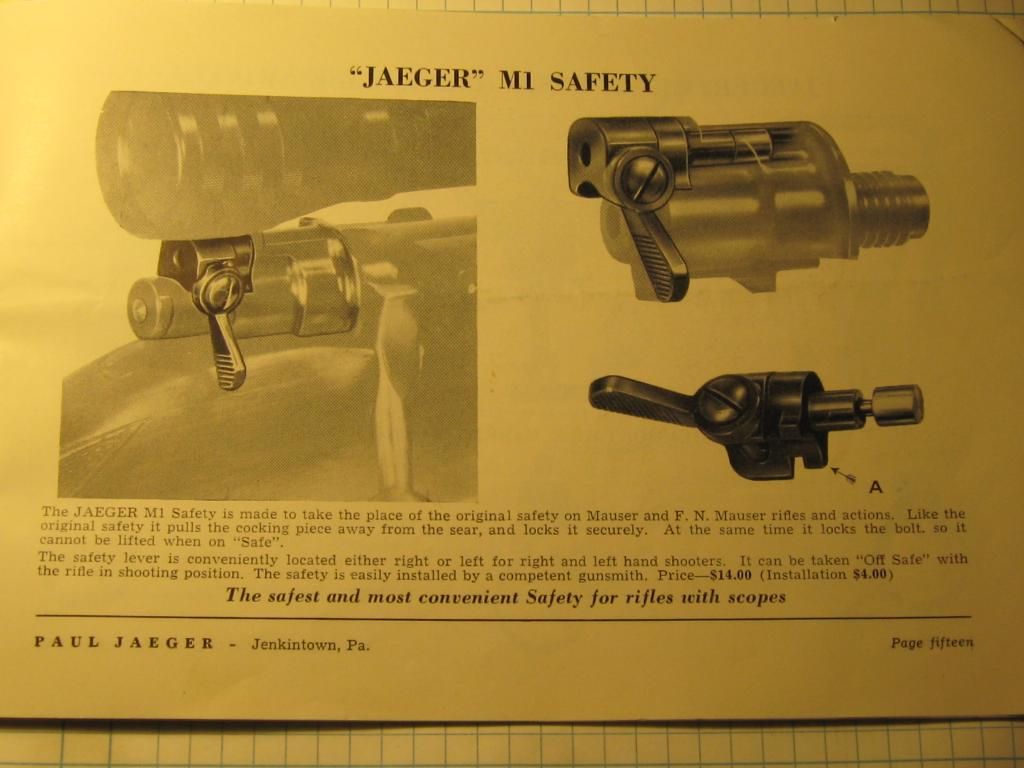 Fred, Thank you for posting the Jaeger catalogue pages of their scope safety. I have this safety on a 1903 Springfield bolt sleeve but have been in the dark as to its origin - until I saw your posting. Does the company list the 03 as a rifle for which they make scope safeties? Gary
