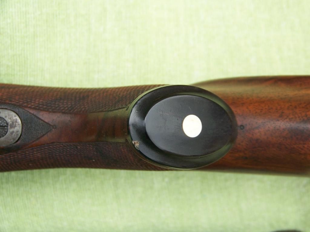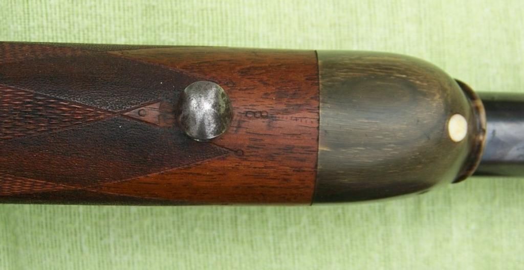 Is that a vestige of Shelhamer's "chin strap" behind the pistol grip? Hard to tell. The dominating cheek piece is a bit off-putting though, but does tickle my memory of someone's work but I can't put my finger on it. I'll guess too that someone added the stipling around the checkering (and the punch marks), and the horn tip looks like a replacement/after thought (I think I see traces of tearout in the walnut where it was cut for the tip plus the tip doesn't look flush with the walnut in a couple places). I could be seeing things, though.