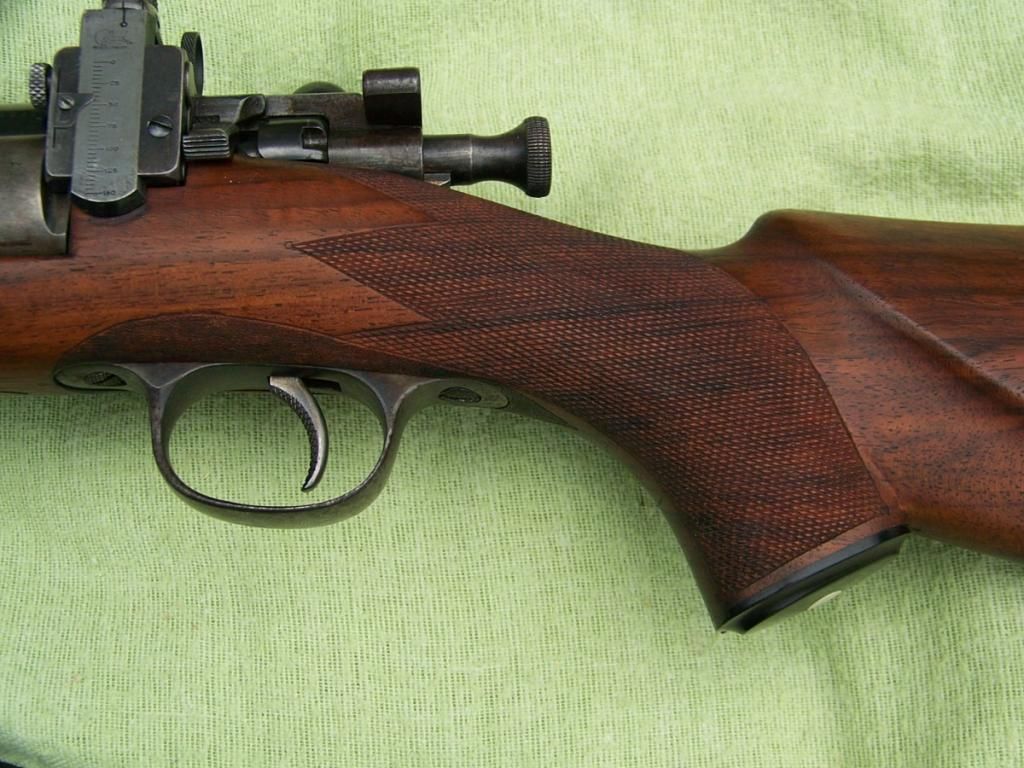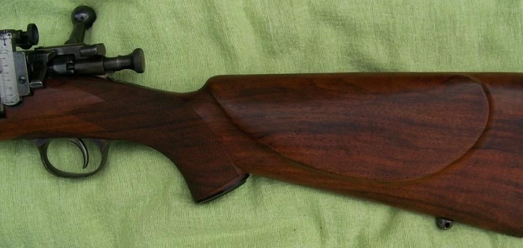 Terry is correct, I'm almost positive that it's by James V Howe. The shaping of the trigger guard matches what he did on two of my Howe '03 rifles plus all the punch markings and ivory dots. The Niedner barrel number shows the barrel was made in 1934 while Howe was in Cleveland. Pretty sure that Howe would have had Niedner do the barrel in 25 Krag and then Howe made the gun. Notice the reshaping of the tang and Michael wrote of Howe case coloring TGs, this one has case colored TG, loading gate and side plate. Add to this all the stippling in the checkering patterns and around the TG. One of my Howe '03s has a similar front sight ramp with the curved shape on the sides.