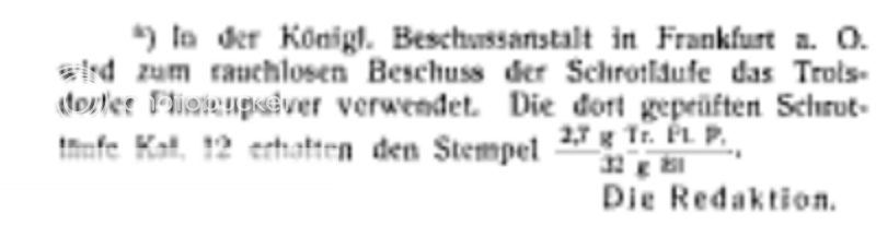 Again Ford, you are correct as I grabbed the wrong paragraph:  Flintenläuf - Reichsgesetzblatt v. 23. Juli 1893  Troisdorfer Flintenpulver by the Frankfurt on the Oder proof facility Kind Regards, Raimey rse