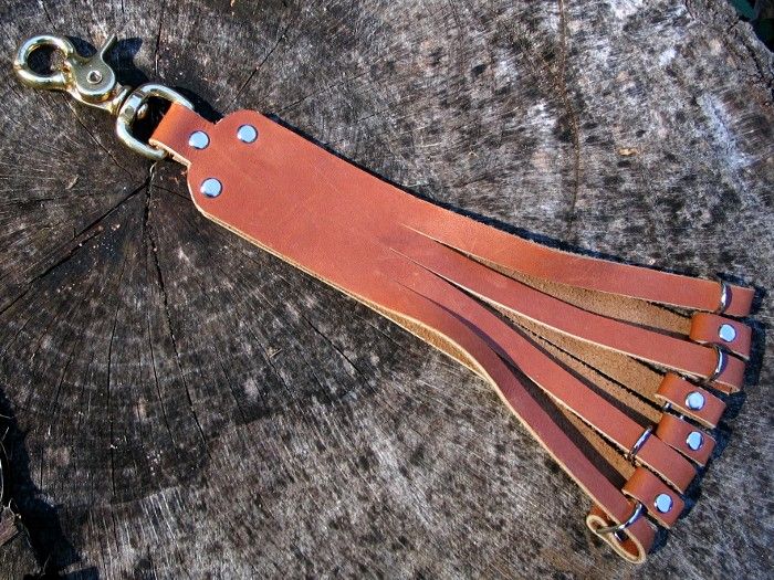 Those are simple. They are four strands cut to 30" with a two wrap hangman's noose as the slide. Double the cord over a snap or solid ring and lash the strands together with another short section of cord. I did that setup in nickel but I have also done them with brass hardware. To me the antique brass finish looks much better. The first one below is deer hide, the rest are varying grades of cow leather. Some work better, others make better photo props.