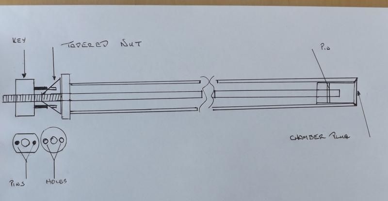 I would index the rod to some arbitrary degree, 45, 60, 90 or other, and cut another key slot back toward the breech end, starting at 70mm, and ending at 30mm. The locking cartridge would act like the bolt of a rifle. I would turn a sleeve of chamber size od, and bar size +1mm id, and then thread a 5mm set screw through the sleeve at 75mm from a turned rim/base. Protruding 2mm into the sleeve.