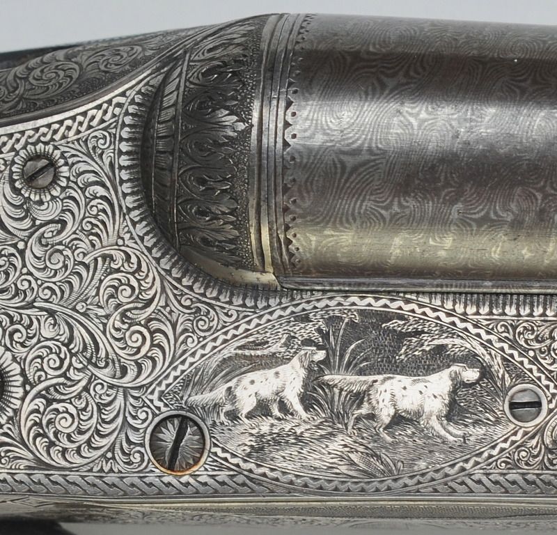I too am enjoying these examples of the early American engravers. Just to re-calibrate on Loy dogs and his scroll--these from a signed gun.   And this from a grade 3 that I attribute to him that illustrates the "quotation marks" he used to finish the scroll moving into a plain area.  I don't get the sense that the dogs have a necessarily short snout. There is also a contemporary Ithaca engraver with Loy--a man by the name of Simeon Rogers. Rogers came from Meriden with Loy and they roomed together. They must have been very close friends as Rogers was Loy's executor of his estate. I have never seen a documented work by Rogers BUT they very well could have similar styles as they both trained under that master Parker engraver Harry Gough. The dog photos have a lot of image structure and enlarge nicely should you care to do that.