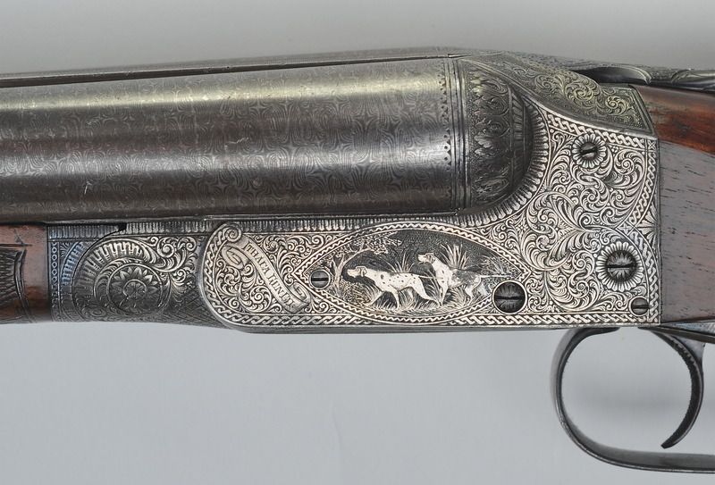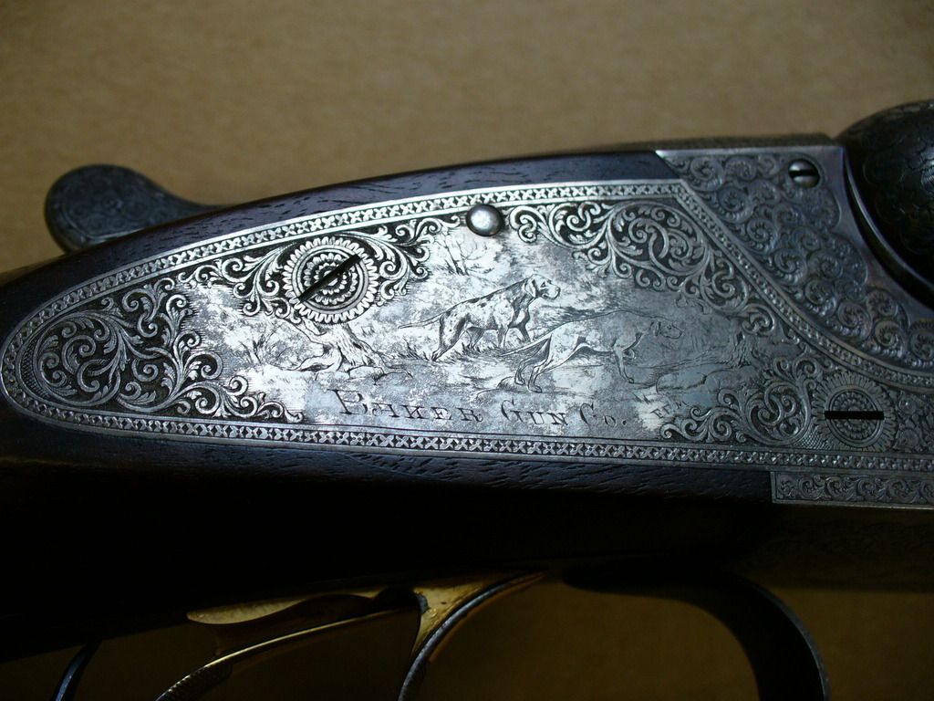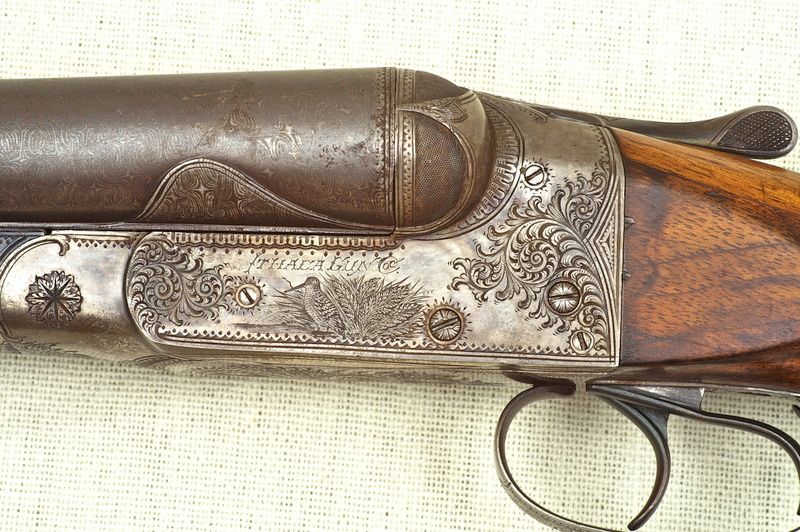 Jason, I seem to have an afternoon free, waiting to go to Canada for some upland hunting tomorrow. Here's an effort by Frank E. Mason, the Baker factory engraver at the time. John Houchins said Mason worked at L. C. Smith in the 1890s and I think came to Baker Gun and Forging Company around 1896. He was the factory engraver for a dozen or more years. Note Mason's initials below the right front foot of the dog to the right. By the way, I really like the scroll where the background is cut away on this gun and on the Loy signed gun Walt shows in the following post.