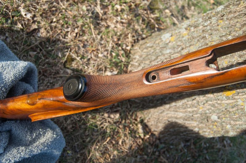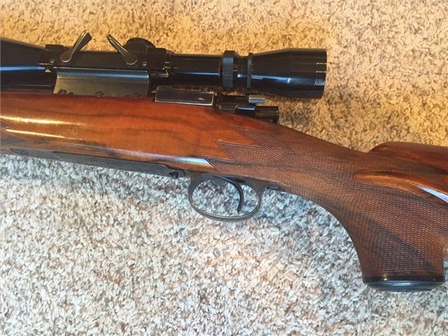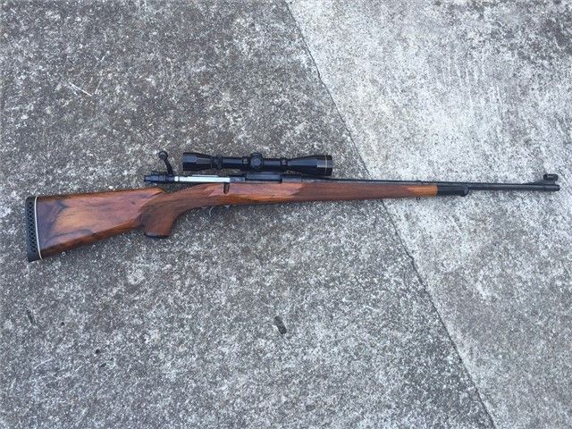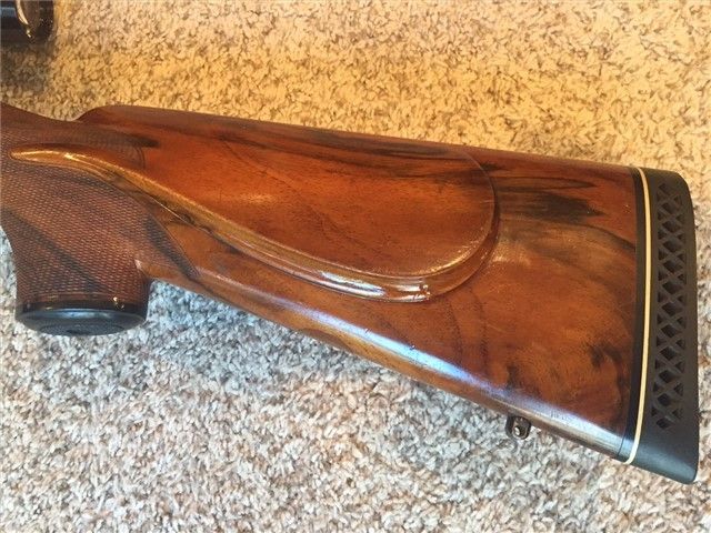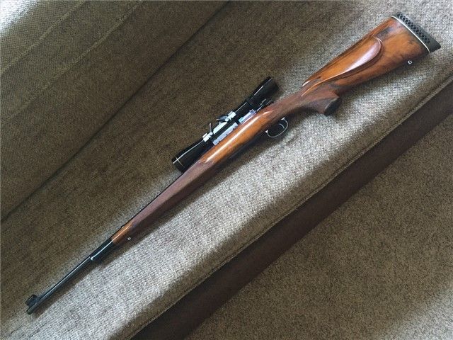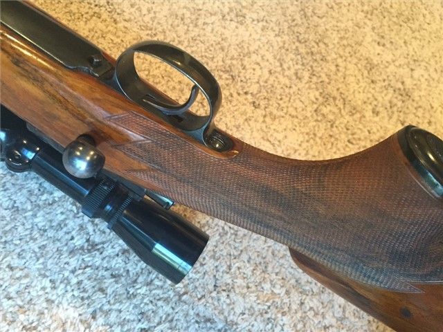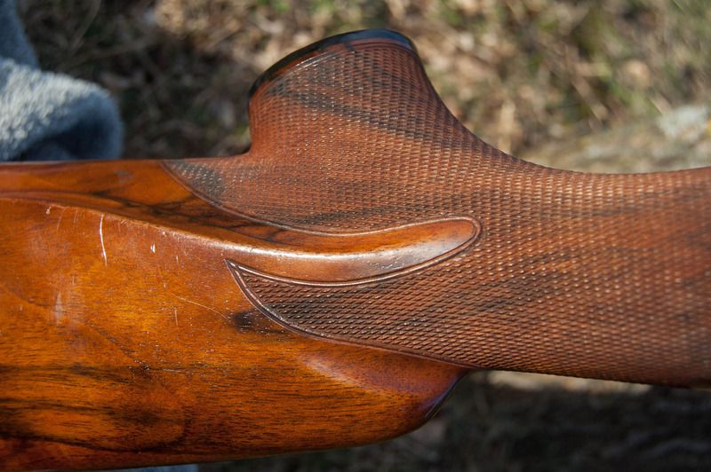 A friend of mine, not good at the posting stuff, recently acquired this rifle. There are no makers marks on the stock anywhere. The barrel maker you can see in the one pic and and is dated 1957.The cheekpiece treatment is quite unique and I have never seen anything like it before. Checkering is very good quality and done by somebody who knew what they were doing. The wrap around on the pistol grip tells that story. The action is a FN Mauser and chambered in 300 H&H