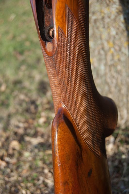 The forend tip looks like some I've seen on SR Griffins work, but the similarity to his stocks ends there. If I had to name a known stocker it would be Linden. The checkering quality, amount (a lot), zig zags in the leading and trailing edges of the pattern, and especially the way it comes together in the front of the grip remind me of Linden. Didn't he call his treatment of the front of the grip "Cord checkering"? Not sure after that. The wood looks pretty nice for Linden and the cheekpiece looks like a later style, but Linden would be my closest guess.