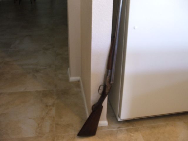 Due to the nature of my work; I frequently get calls from people wanting to sell guns and I got such a call over the weekend. Included with some other firearms is this L C Smith Grade III which I would like your opinions on. I can tell you the following: It was made in 1893 and has 32" chain Damascus barrels. It does not have either a single trigger or ejectors. The gun is worn but shows use not abuse and the barrels are dent free and mirror bright. The stock is full length and has one area that's damaged that I will show in a photo. There is some wood missing but the stock is not cracked thru. The top lever is over to the left as you can see but the gun still locks up like a proverbial bank vault. door Jim